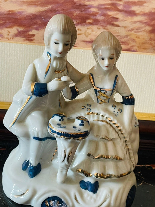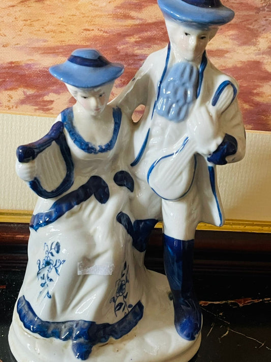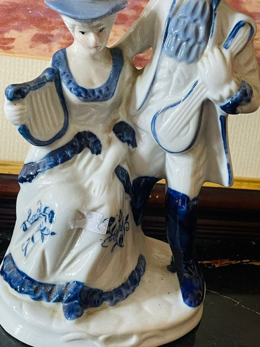 Vintage Blue and White Porcelain Colonial Couple with Musical Instruments (England) Blue Pottery Home Decor