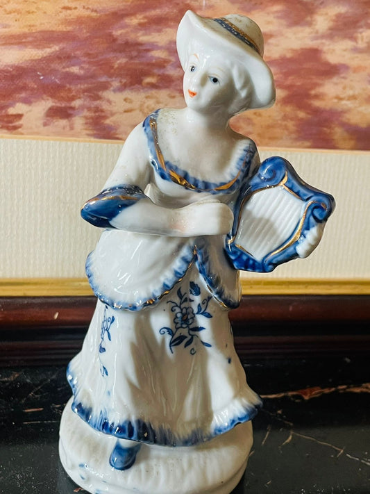 Vintage Porcelain Figurine in White and Blue – Playing Harp (England) Blue Pottery Home Decor