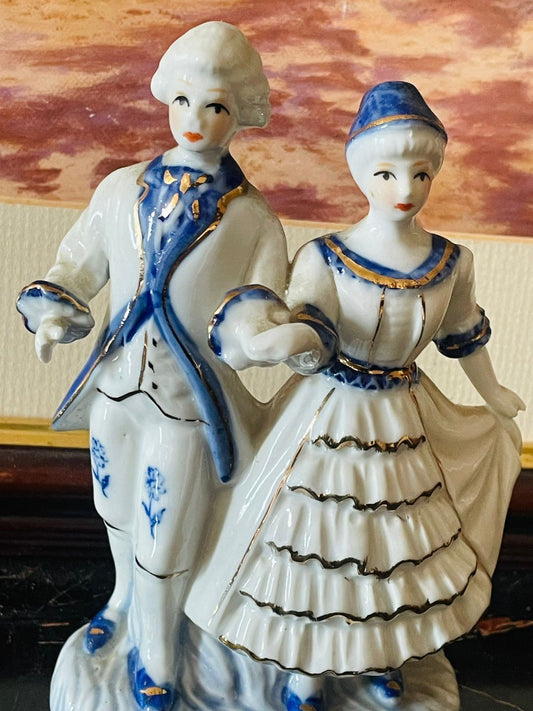 Vintage Blue & White Porcelain Couple Figurine – Elegant Classical Lovers (England) Blue Pottery Home Decor