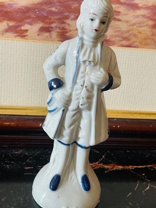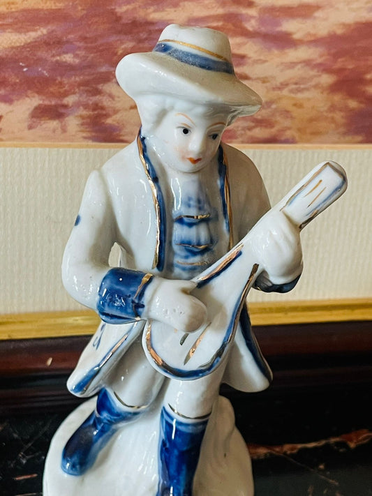 Vintage Blue & White Musician Figurine – Porcelain Collectible (England)Blue Pottery Home Decor