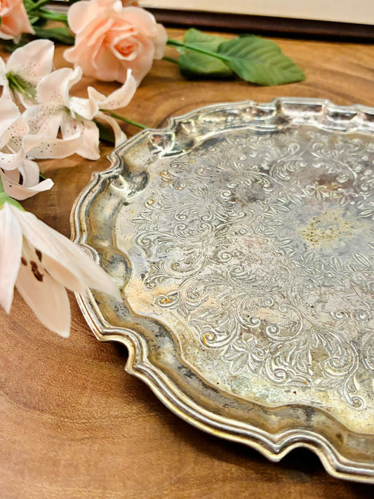 Vintage Silver Tone Embossed Serving Tray Decorative Accent