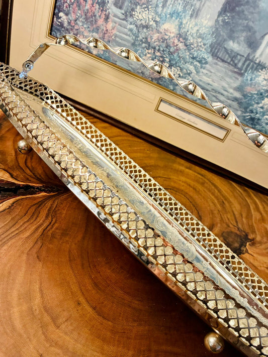 Vintage Silver Tone Gallery Tray with Handle Decorative Accent