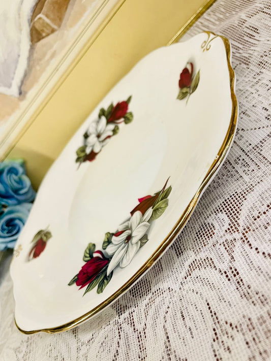 Vintage Duchess Bone China Cake Platter | Red & White Floral Design | Gold Trim
