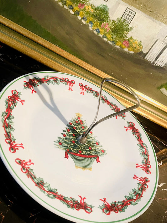 Vintage Christmas Tree Dessert single tier stand — Holiday Porcelain Plate with Handle