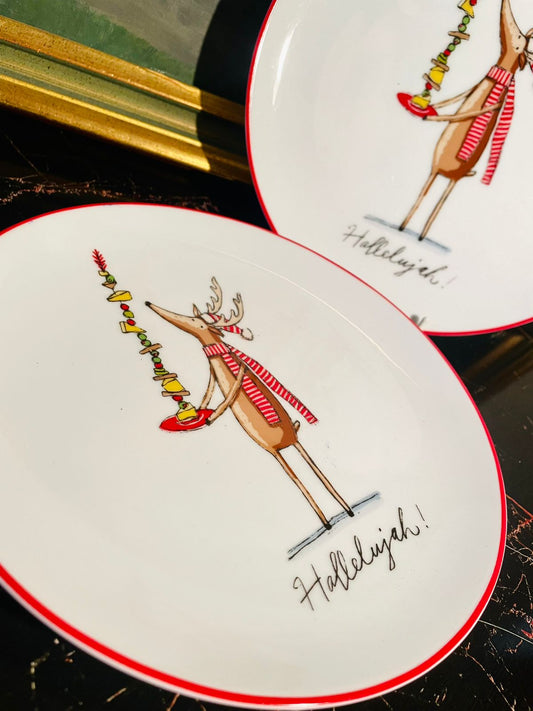 Festive Reindeer Porcelain Plates – Christmas Red Rim Dinner Set “Hallelujah”