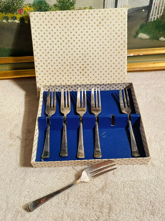 6 Vintage Silver Plated Cake Forks with Original Box – Collectible Cutlery Set