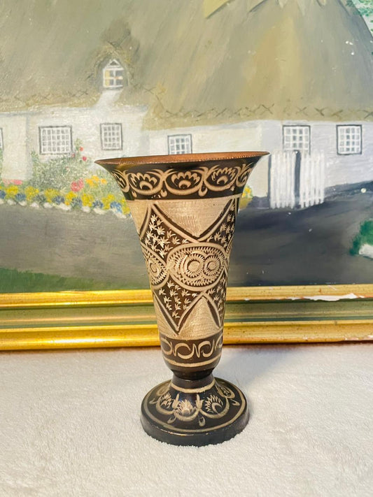 Turkish Vintage Copper Vase – Etched Floral Design in Black & Gold | Antique Home Decor Accent