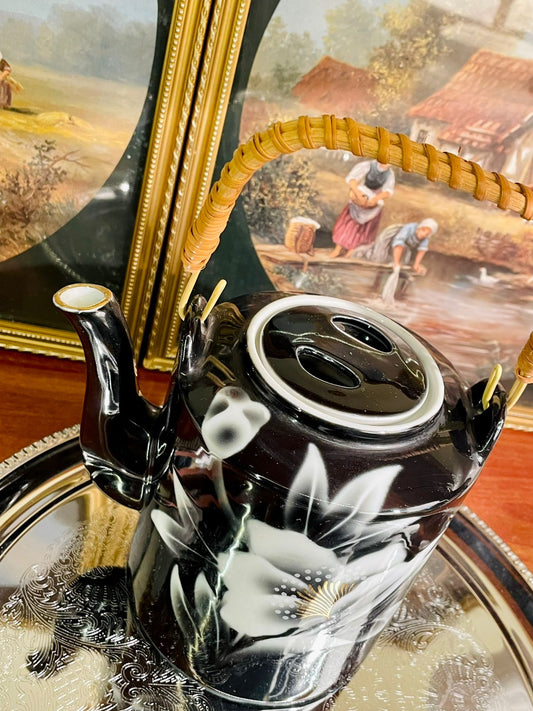 Elegant Black Floral Porcelain Teapot with Bamboo Handle β Vintage Style