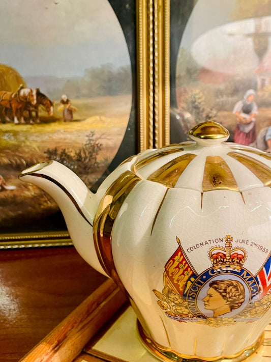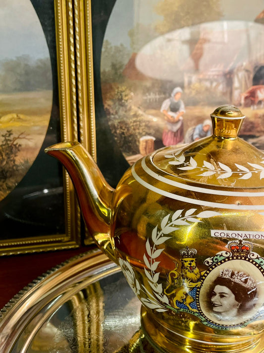 Vintage Royal Coronation Gold Teapot β Queen Elizabeth II Tribute