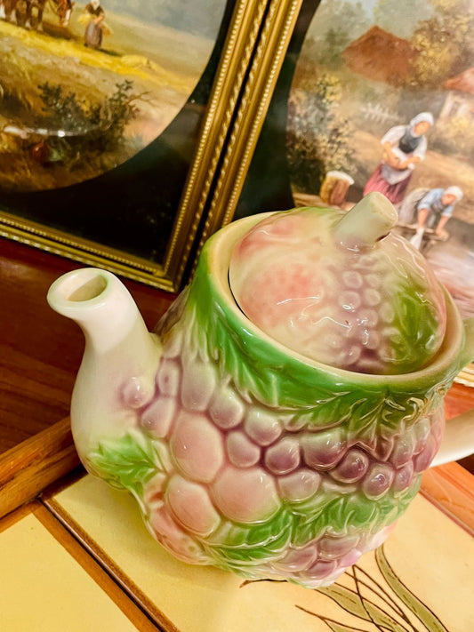 Vintage Grape Cluster Teapot β Pastel Pink & Green Ceramic Kitchen Decor