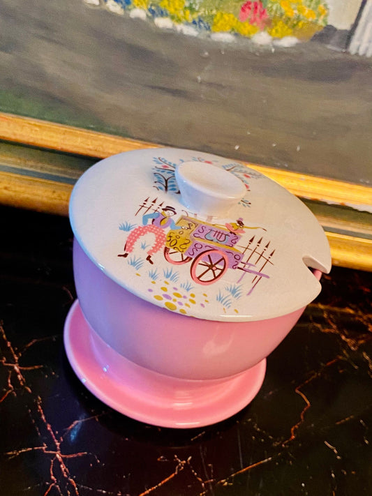Mid-Century English Pink Ceramic Sugar Bowl with Lid β Street Musician Design