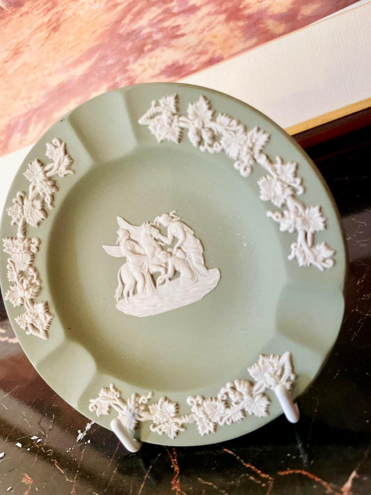Vintage Wedgwood Jasperware Green Ashtray / Trinket Dish with White Relief β England