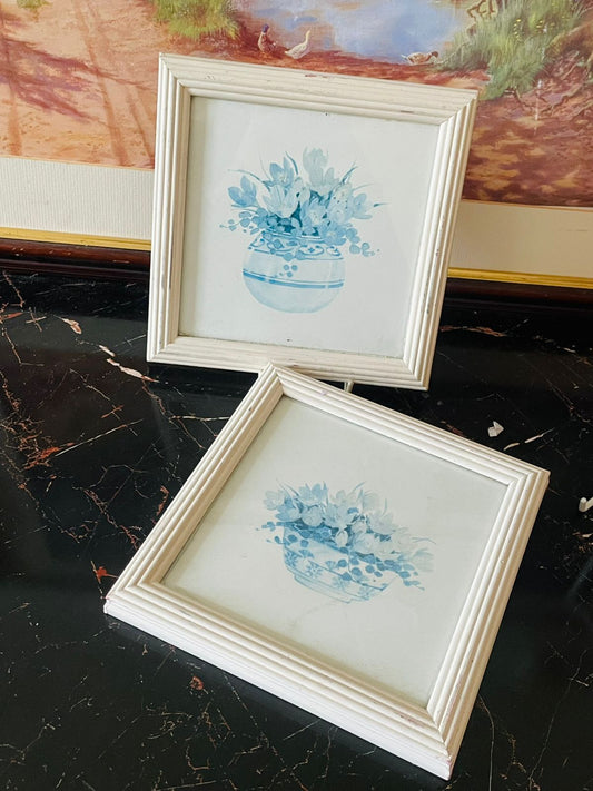 Set of 2 Vintage Blue Floral Wall Frames – Water Color Paintings , England Home Decor