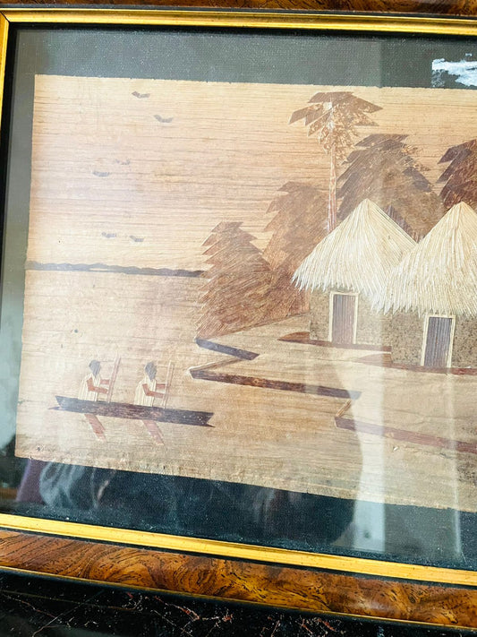 Handcrafted Wooden Marquetry Art – Village & Canoe Scene (Framed)
