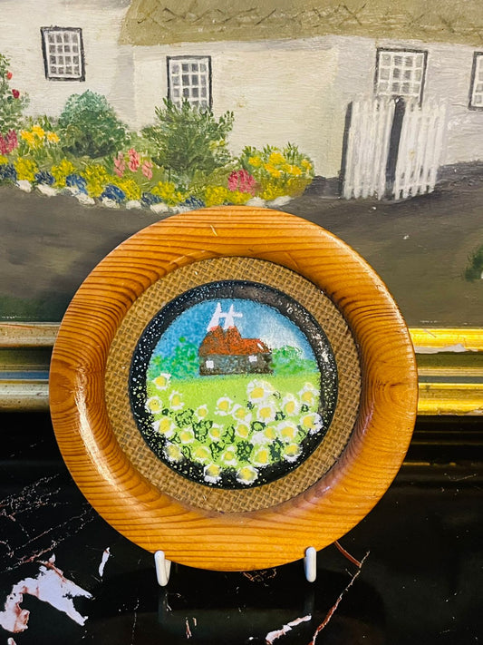Set of 2 Vintage Wooden Wall Plates – Cottage & Windmill Scenic Ceramic Inserts