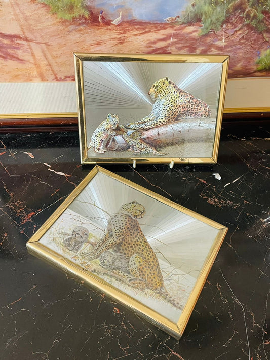 Set of 2 Vintage Leopard & Cubs Glass Frames – 3D Mirrored Wildlife Art Home Decor