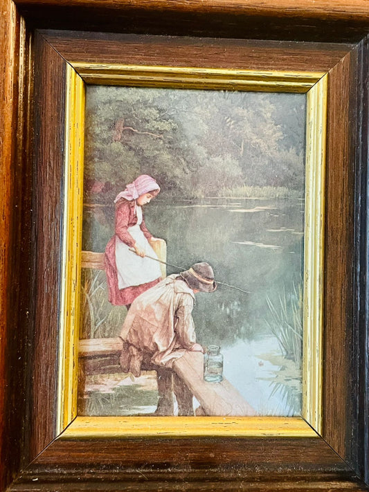Vintage Framed Countryside Artwork – Rustic Wooden Frame Wall Art (Boy & Girl Fishing Scene)