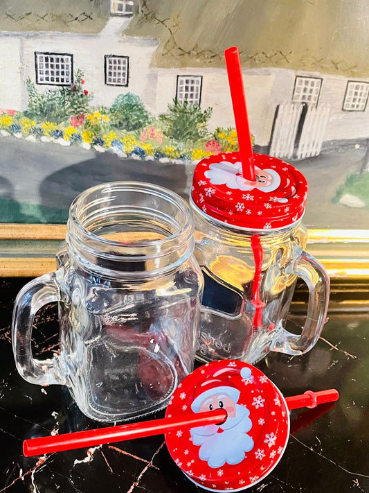 Set of 2 - Christmas Mason Jar Mugs with Lids & Straws