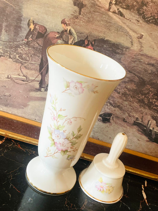 Vintage English Porcelain Vase & Bell Set β Floral Gold-Rimmed βHappy Anniversaryβ Collection