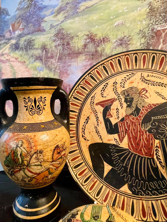 Set of 5 Greek Mythology Hand-Painted Pottery Set β Plate, Vases & Lidded trinket box, Home Decor