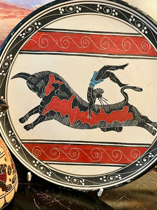 Set of 2 Vintage Greek Pottery Decor Set β Hand-Painted Bull Leaping Plate & Miniature Pitcher