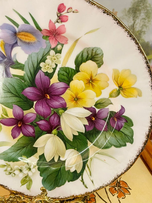 Vintage England Floral Wall Plate 8 in– Decorative Hanging Plate with Gold Trim – Multicolor Flowers