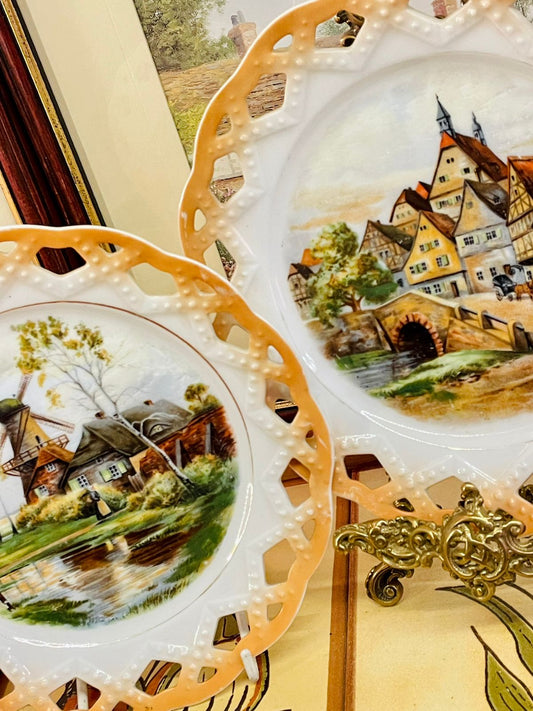 (Set of 2) Vintage Pierced-Edge Display Plates – Scenic European Village Wall Decor