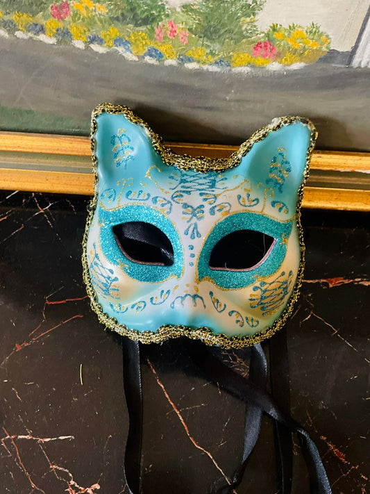 Turquoise Venetian Cat Masquerade Mask – Glitter & Gold Trim