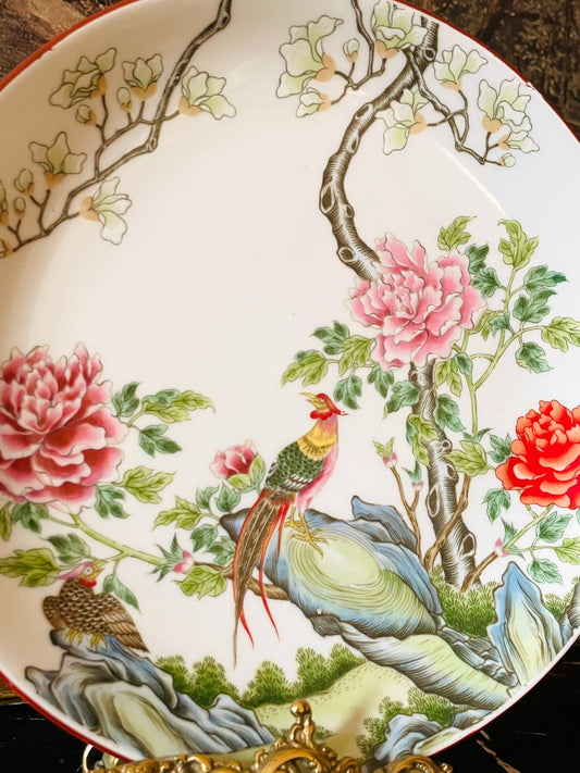 Vintage Hong Kong Hand-Painted Porcelain Decorative Plate – Birds & Peony Blossoms