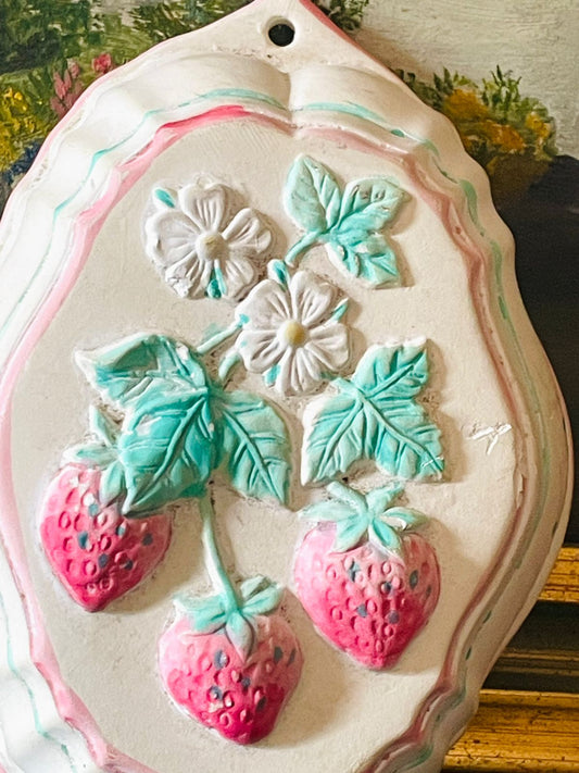 Vintage Handcrafted Strawberry Relief Wall Plaque – Pastel Cottage Charm (England)