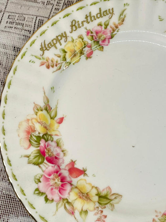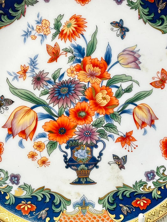Vintage Floral Porcelain Plate with Gold & Cobalt Rim