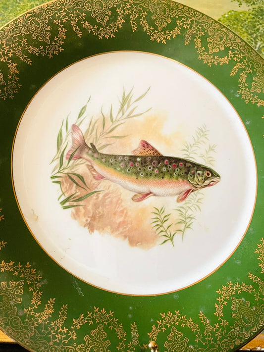 Vintage Hand-Painted Fish Plate – Large decor Plate – Green & Gold Ornate Border Fine Bone China, England