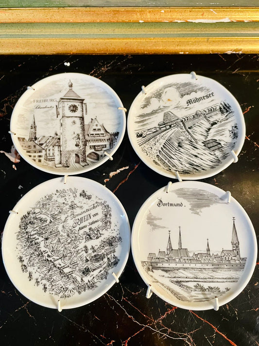 Vintage German Souvenir Porcelain Decor Plate – Mini wall decor plate - Black & White City & Castle Illustrations