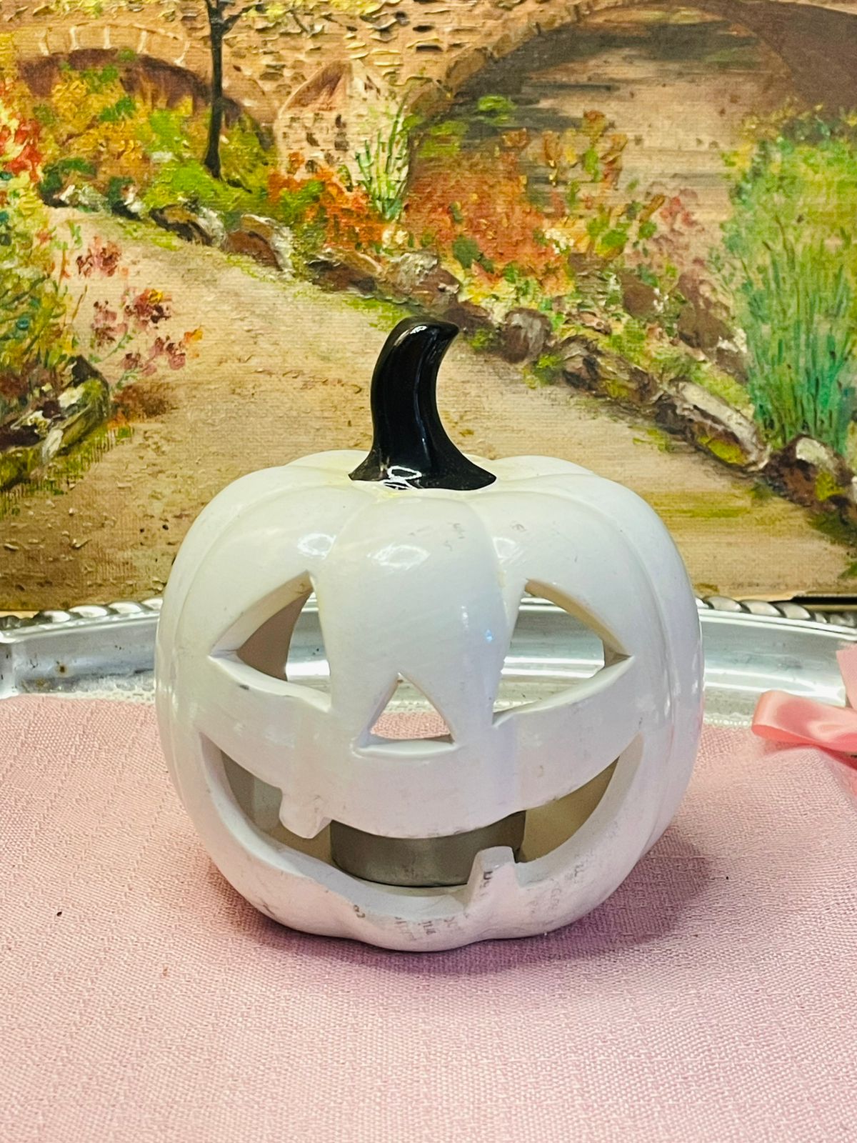 Adorable smiling ghost figure with pumpkins – brings Halloween cheer without the scare!