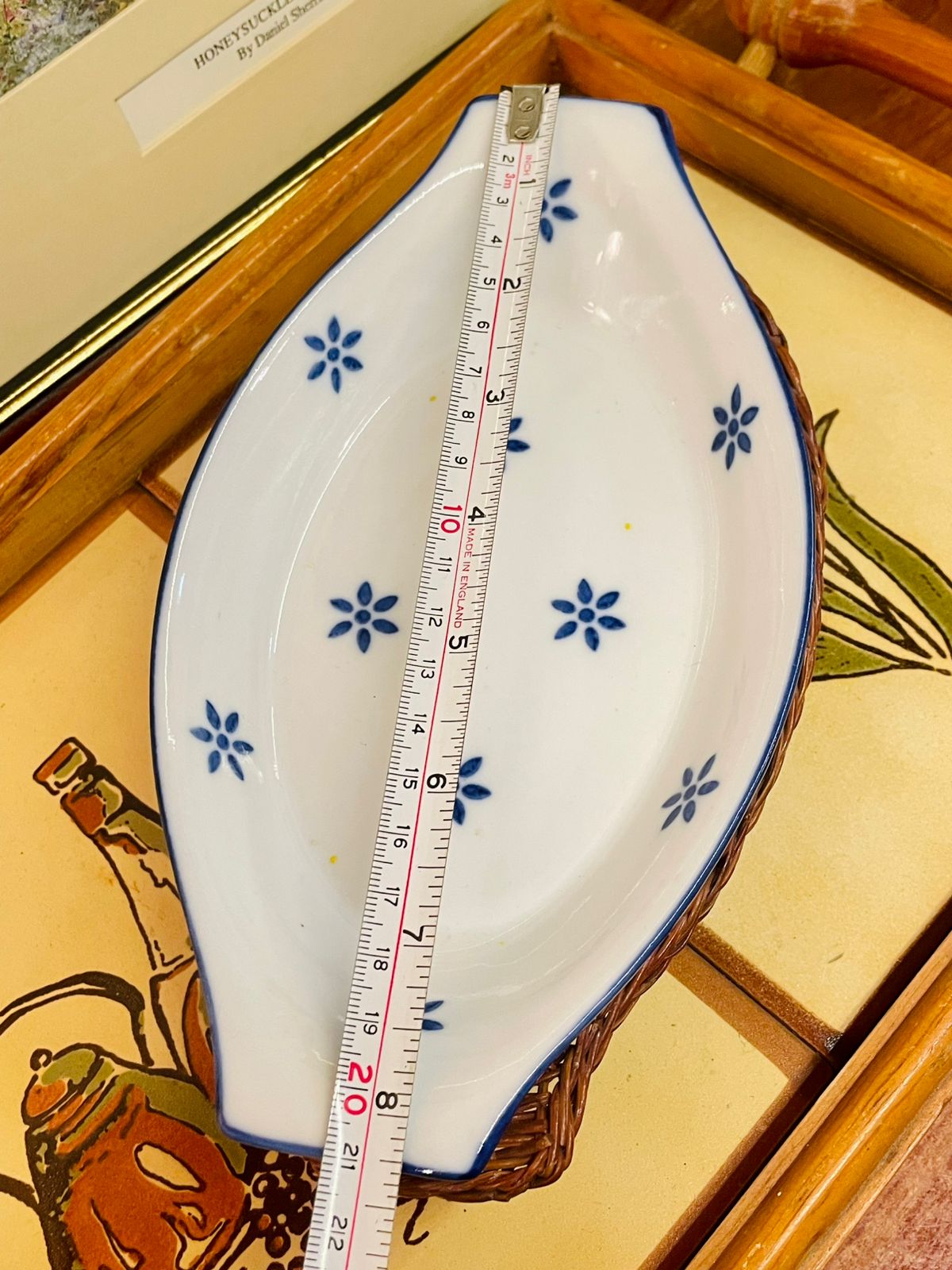 Bring a cozy cottage charm to your home with this Oval Blue Floral Ceramic Serving Dish, beautifully paired with a hand-woven wicker basket for rustic presentation. Ideal for both everyday serving and decorative table styling.