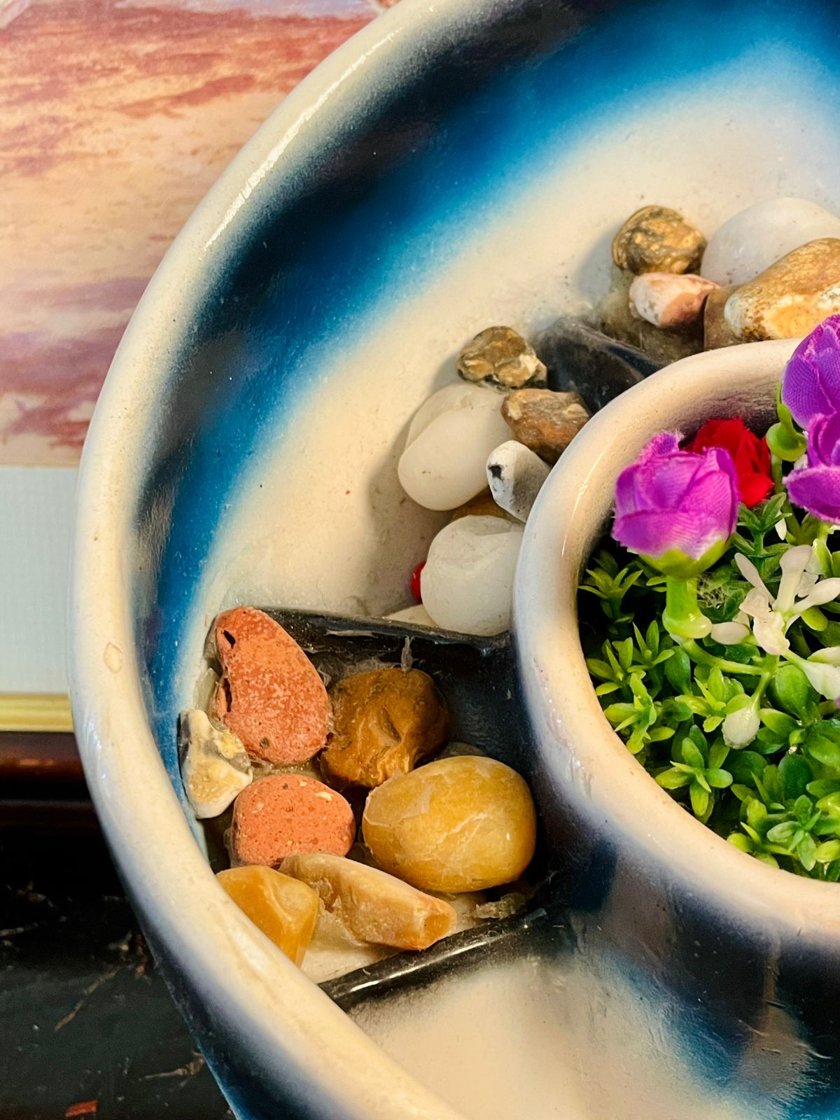 Ceramic Wave-Shape Planter with Decorative Stones & Artificial Flowers – England