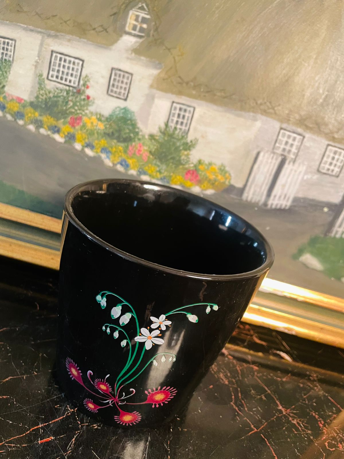 Design: Striking black gloss base featuring hand-painted woodland florals, ferns, and butterflies in vibrant colors — inspired by British moorland flora