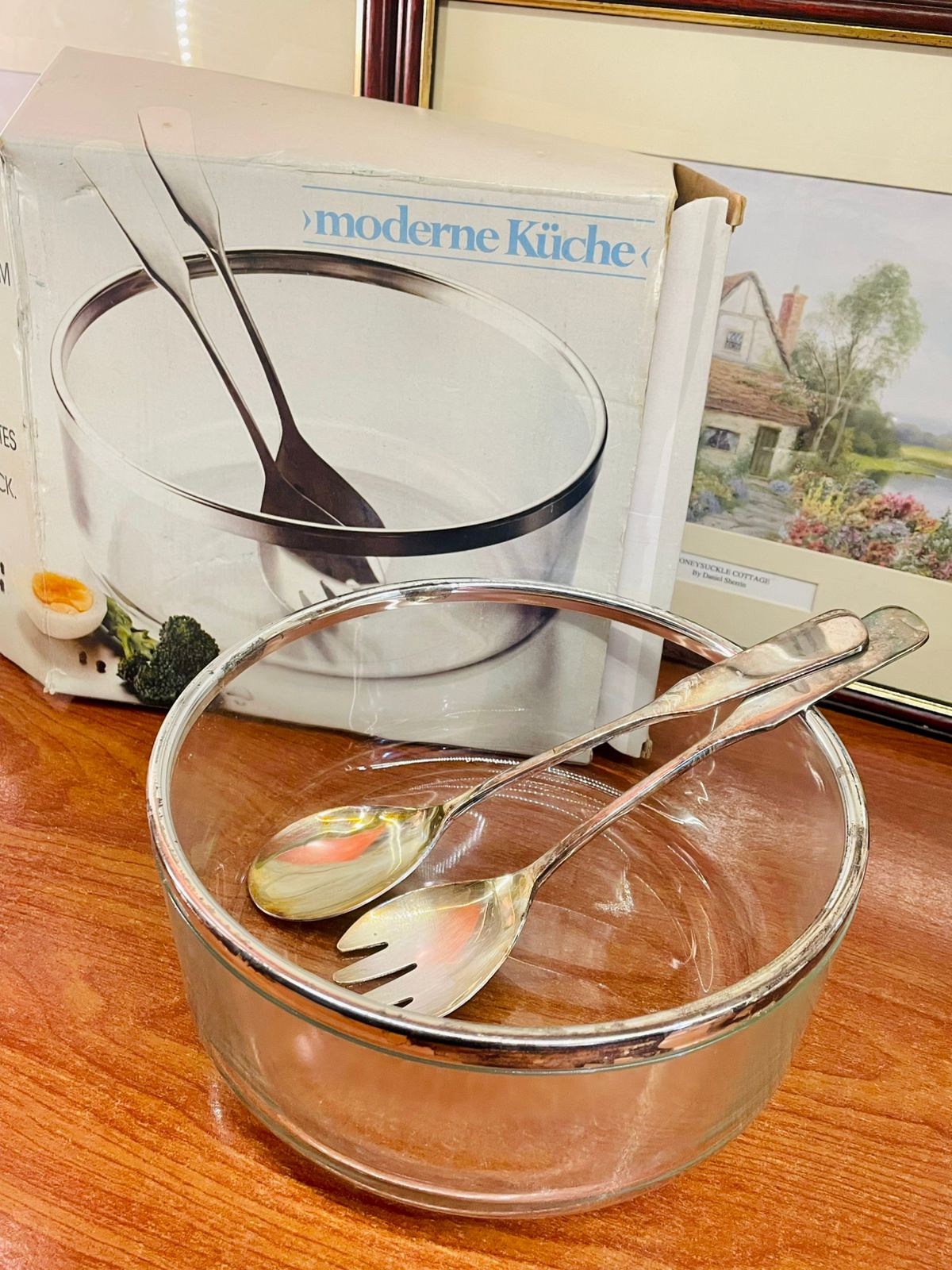 This elegant Clear Glass Salad & Serving Bowl Set brings a modern yet timeless touch to your dining table. With its polished chrome rim and included serving utensils, it’s a stylish choice for family dinners, gatherings, and everyday meals.