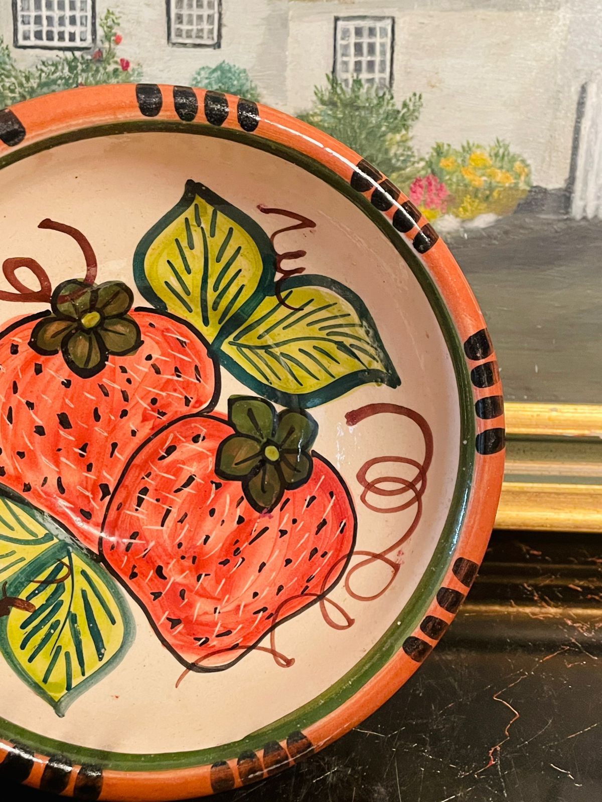 Design: Charming hand-painted strawberries and leaves motif with green rim and rustic red exterior
