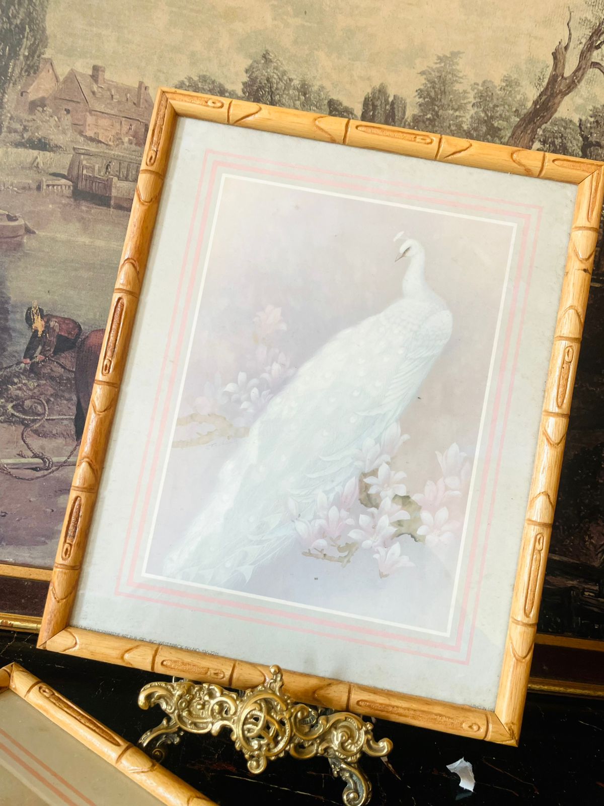 Pair of Vintage White Bird & Peacock Prints – Bamboo Style Frames (England)