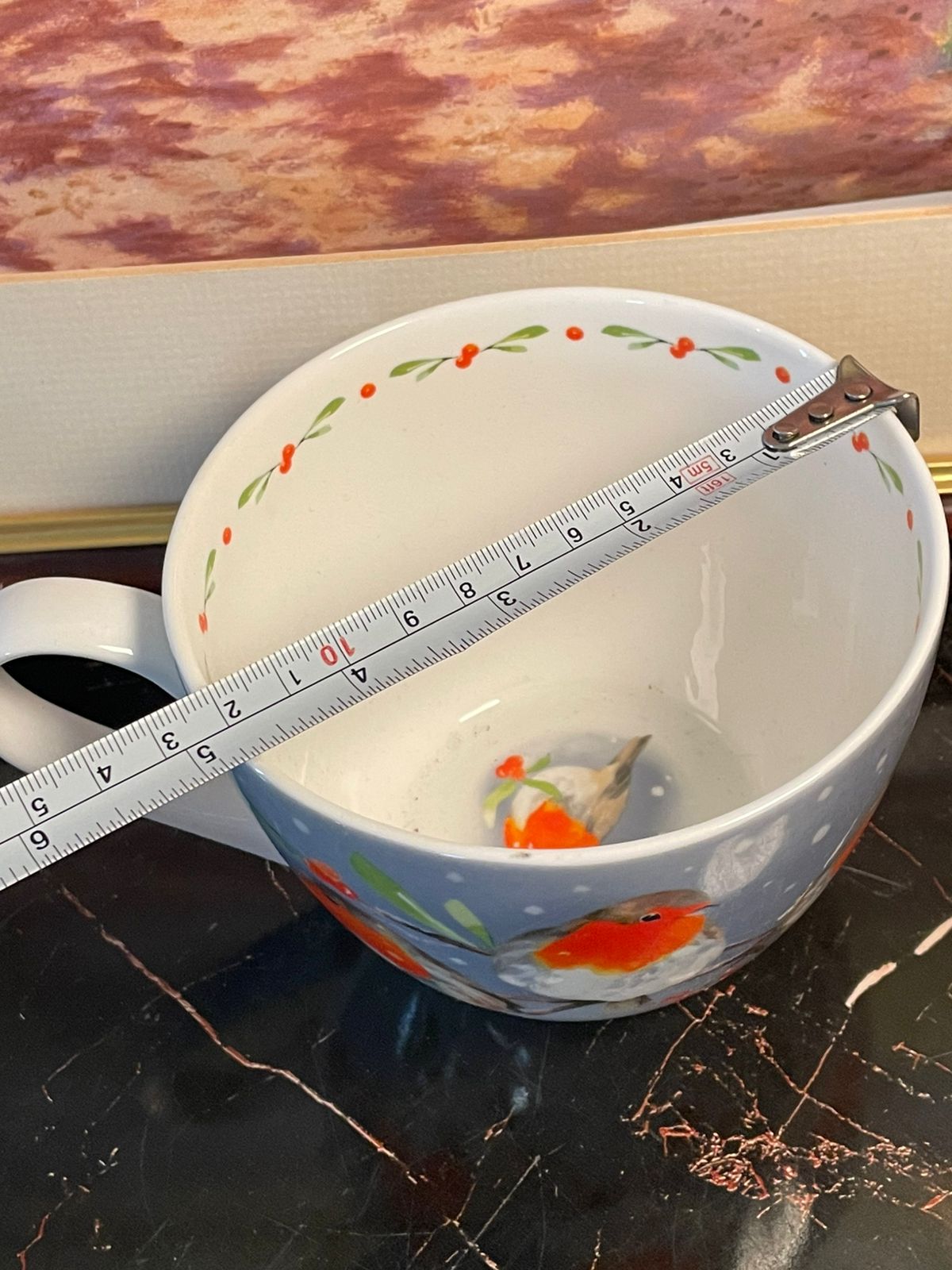 Size: 12cm diameter, approx. 9 cm tall – large cozy mug size for tea, coffee, or hot chocolate
