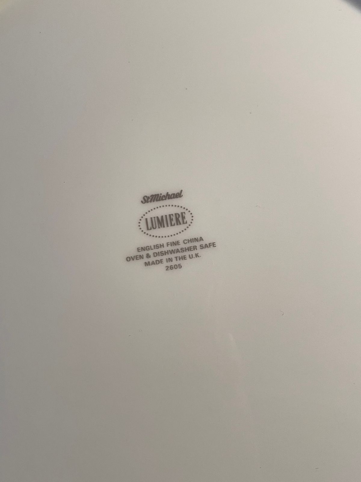Speciality: Elegant white porcelain plates with a subtle gold rim – timeless minimal luxury design by St. Michael (Marks & Spencer)