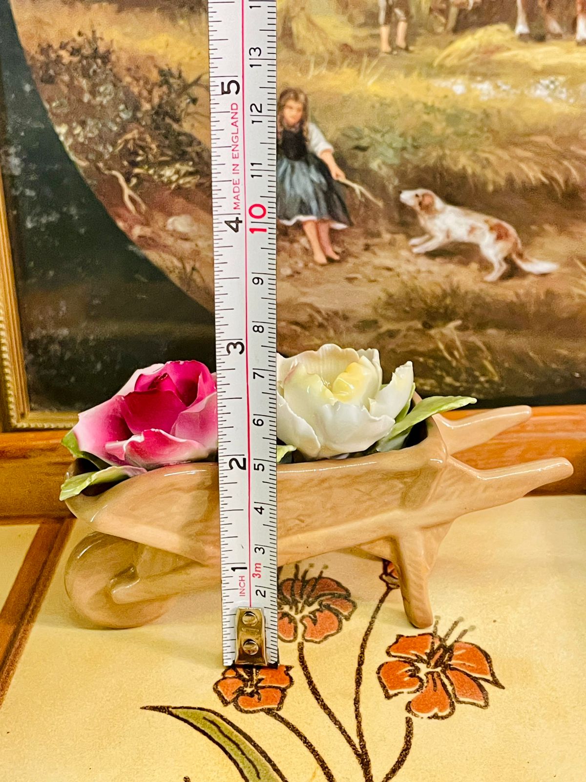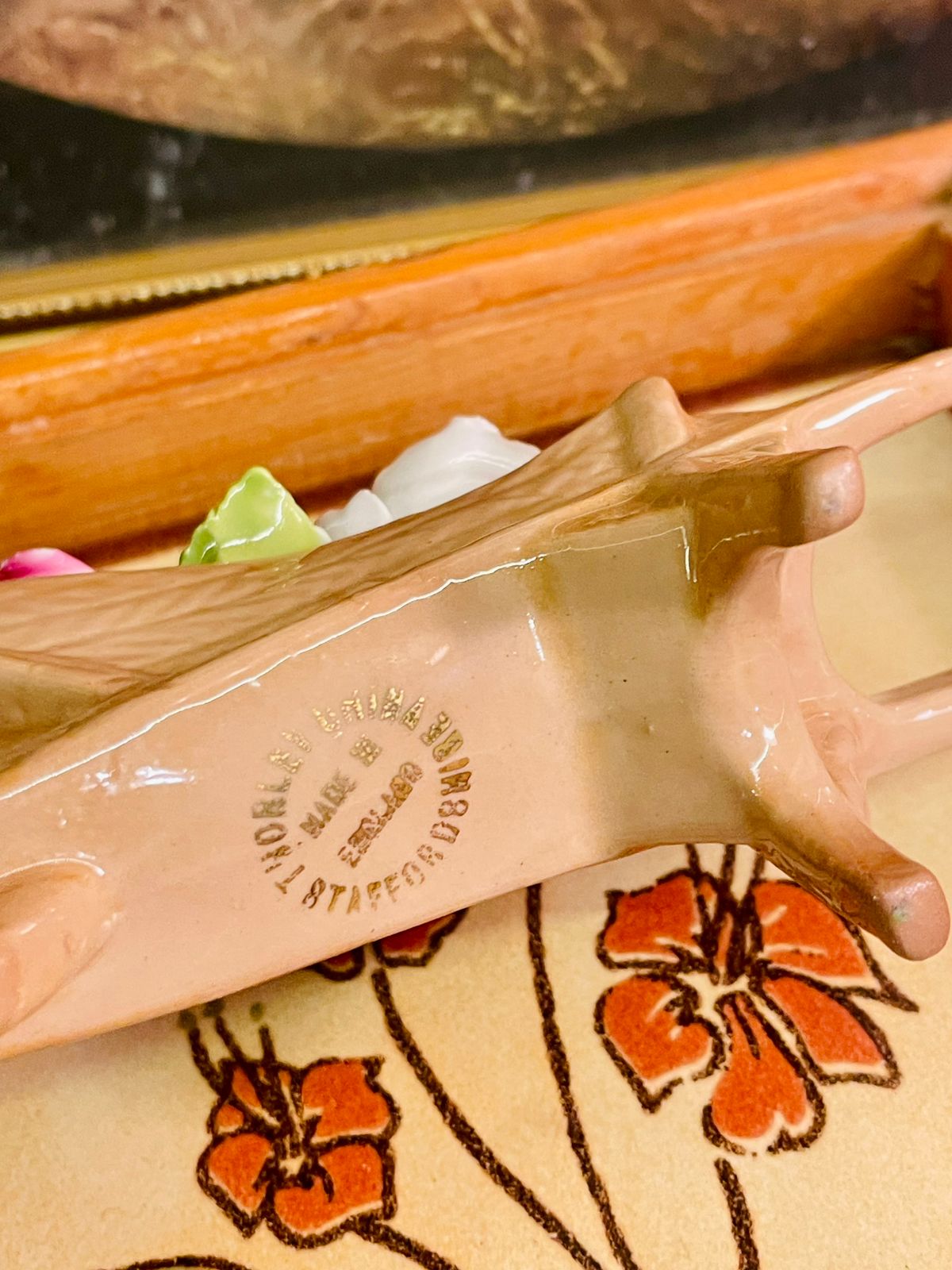 A rare and whimsical collectible from Thorley China, Staffordshire, England. This charming floral posy features hand-sculpted bone china flowers arranged in a beautifully crafted fawn-shaped planter. Soft pastel petals in pink, white, and yellow tones give a gentle cottagecore elegance — perfect for curio shelves, vanity décor, or collecting English treasures.