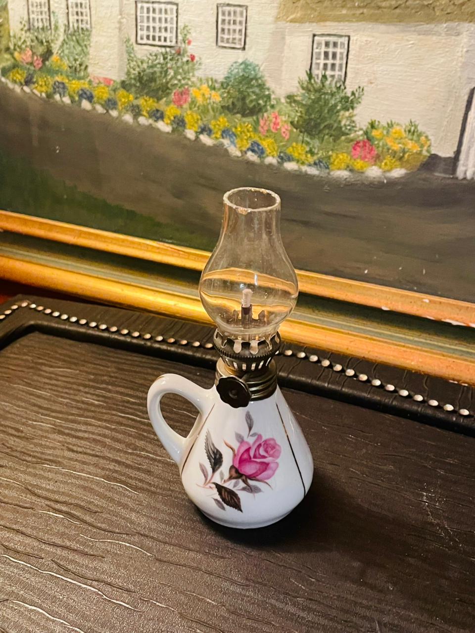 vintage miniature oil lamp, 1950s oil lamp, hand painted oil lamp, collectible oil lamp, made in England, vintage decor, ceramic oil lamp, antique mini lamp, English vintage collectible, retro home decor, vintage lamp ornament, farmhouse style mini lamp, oil lamp gift idea, old fashioned lamp, tiny vintage lamp