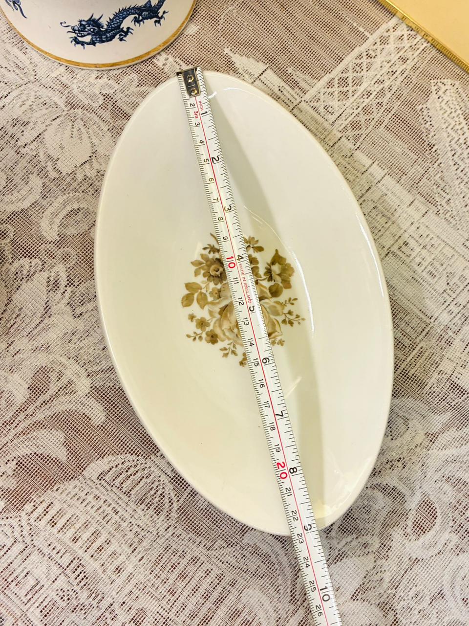 A charming vintage Bavarian oval serving dish featuring a delicate sepia-gold floral bouquet in the center, designed in the same elegant style as classic German porcelain tableware.