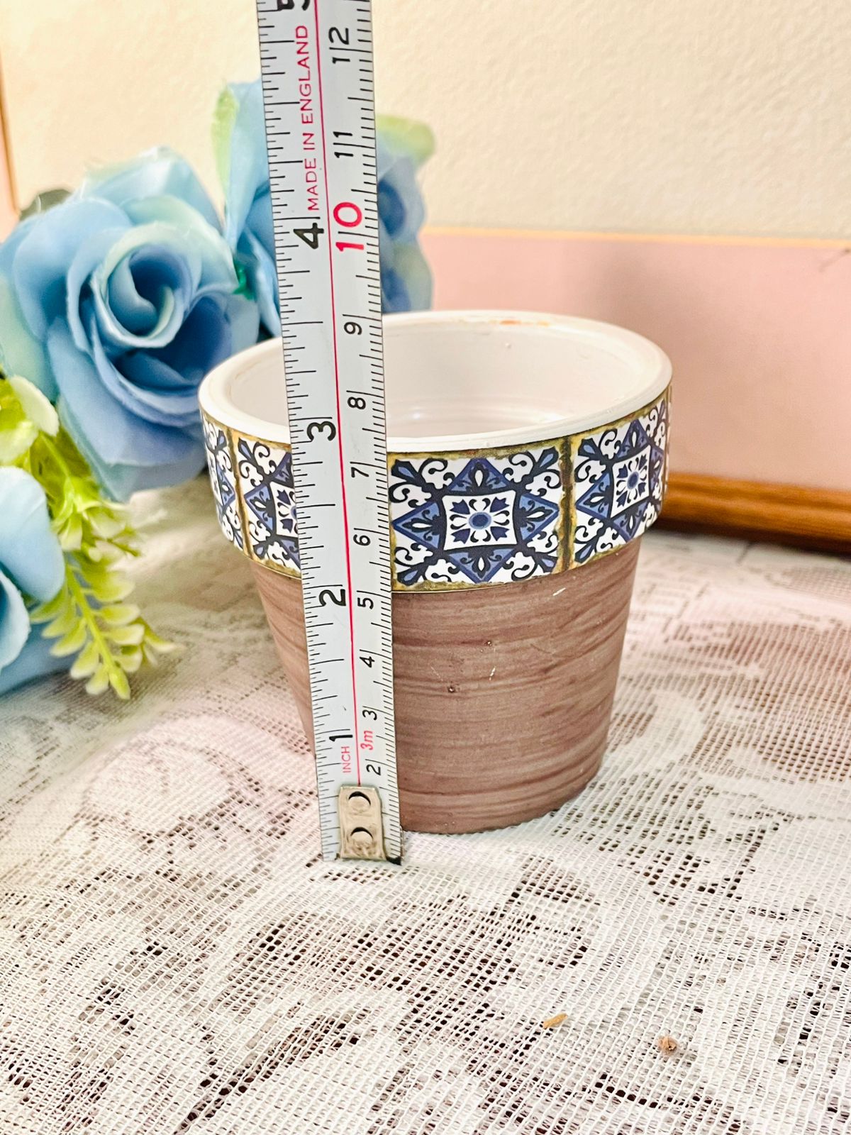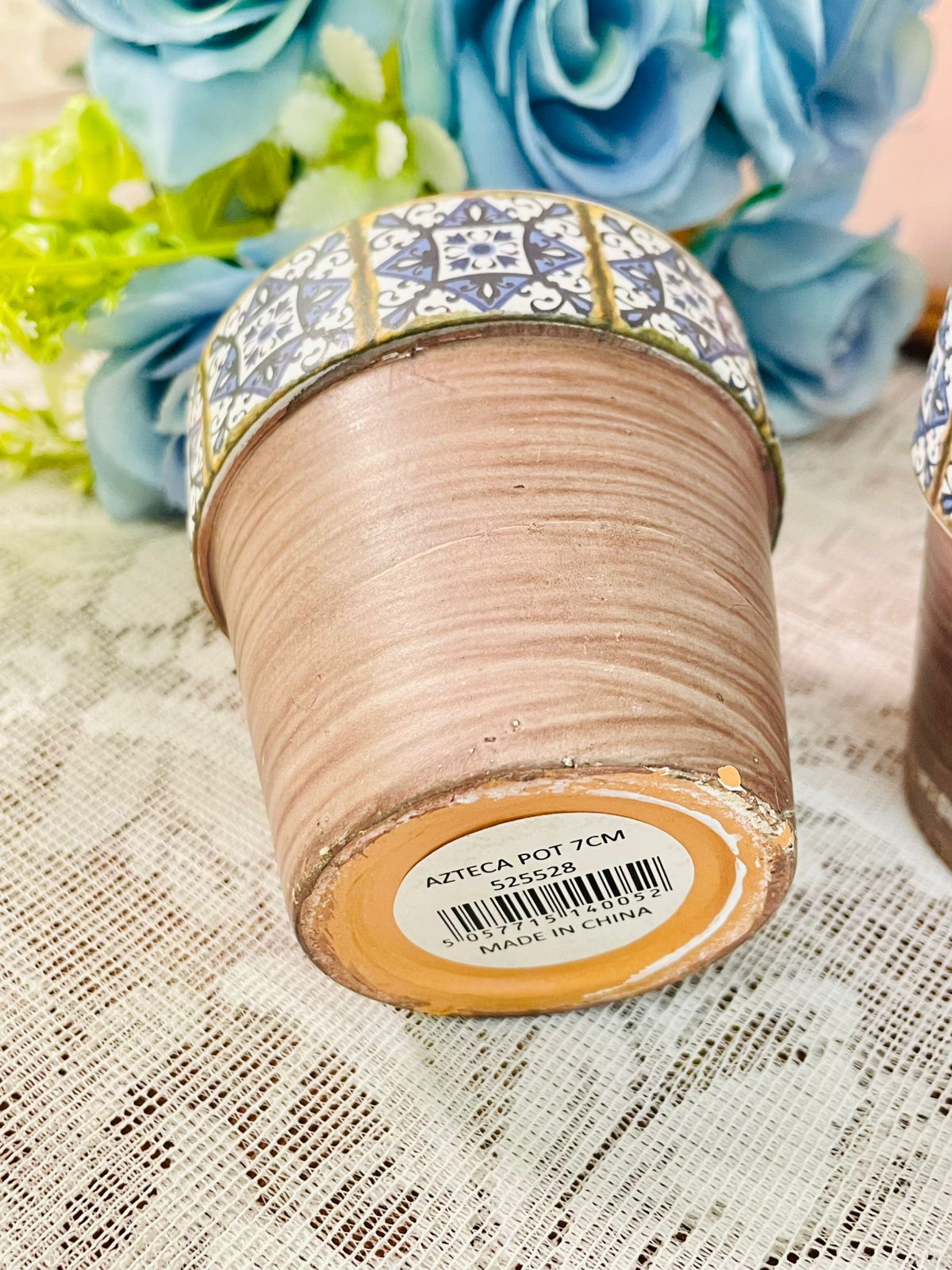 The contrast between the intricate patterned border and the rustic lower body creates a timeless aesthetic that feels collected rather than purchased. Perfect for cottage-core interiors, Mediterranean-inspired spaces, or farmhouse displays, these petite planters offer both decorative beauty and practical charm.