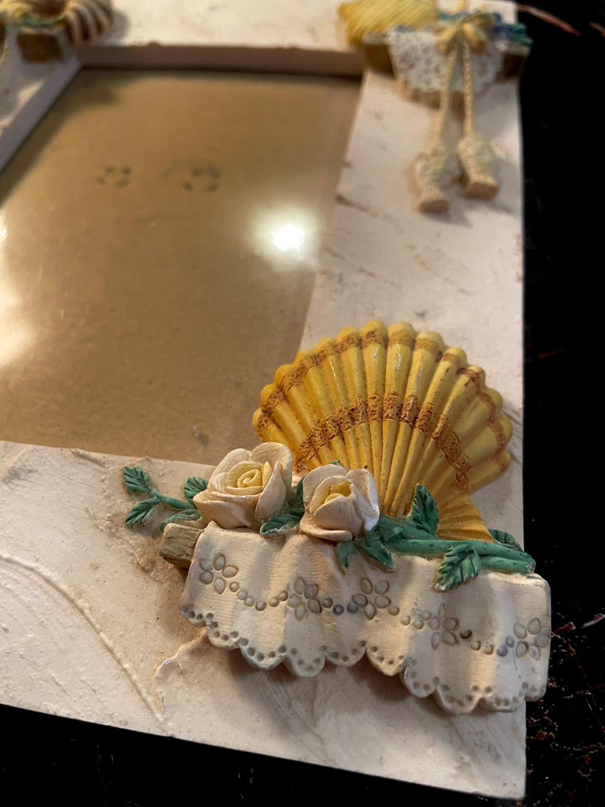 - Design: Rectangular decorative frame with shell embellishments, floral accents, rope tassel details, vase motif, and textured cream finish