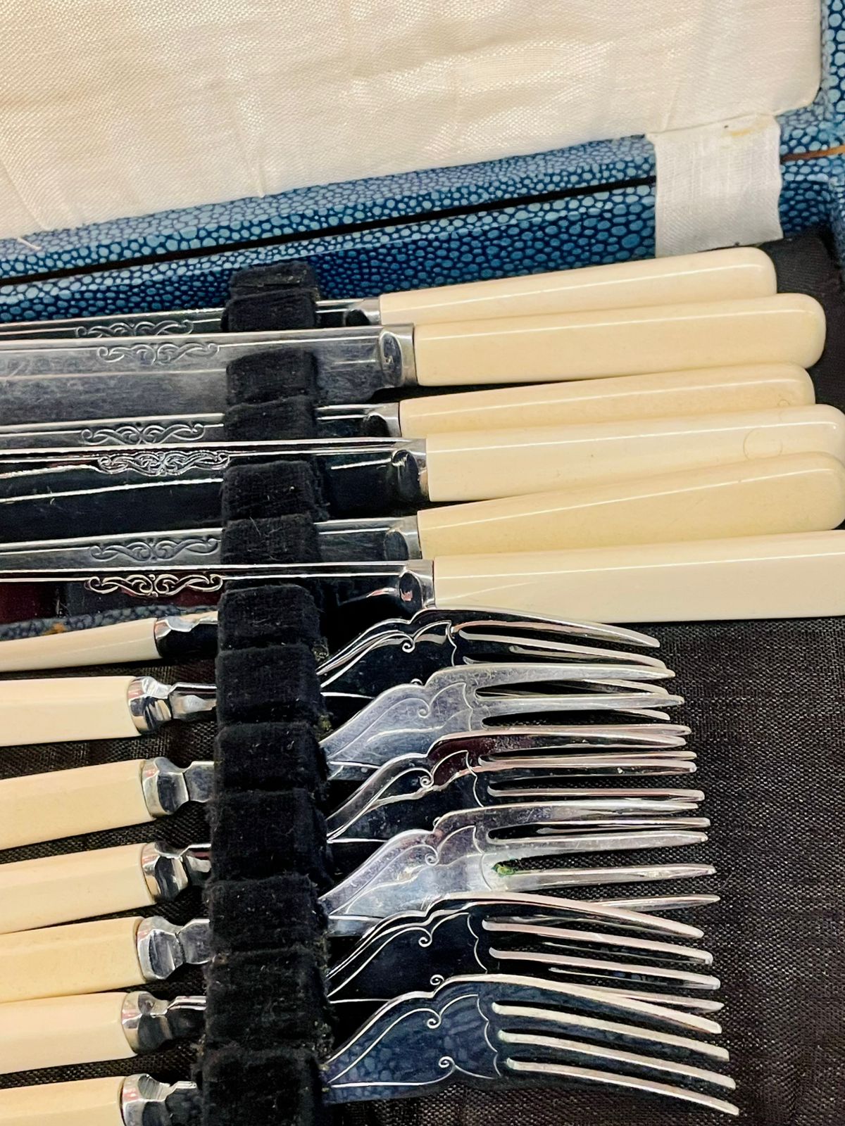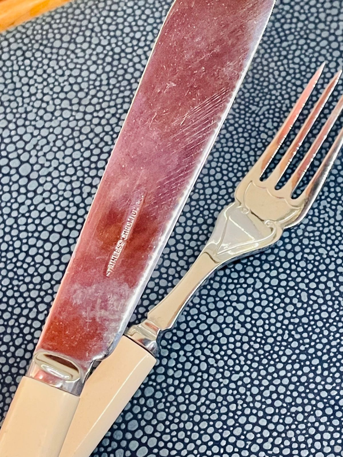 Design: Elegant 1950s–60s style set with decorative engraving on blades