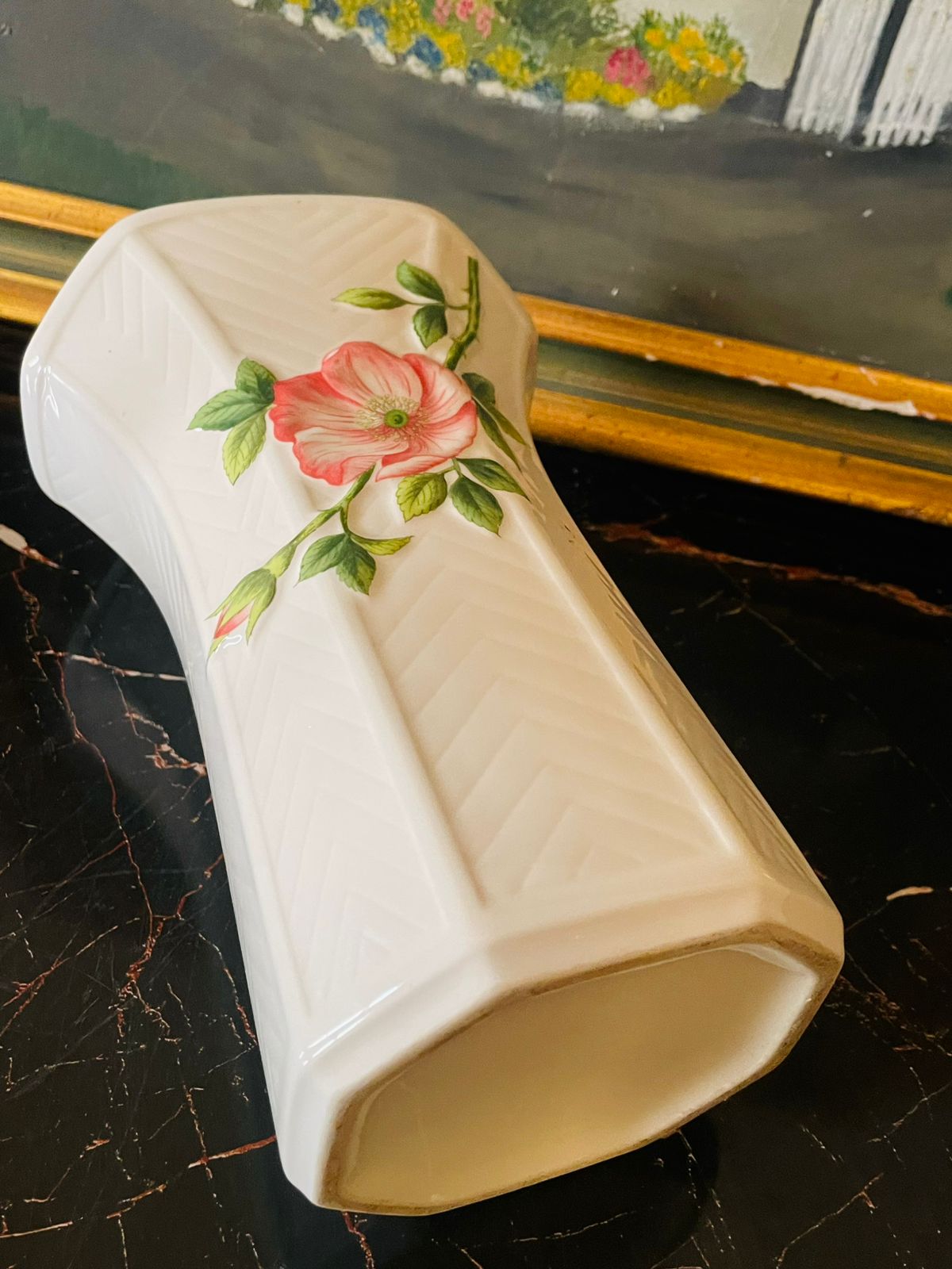 Add refined charm to your decor with this Vintage English Porcelain Hexagonal Vase, featuring a beautifully hand-painted pink wild rose motif. The soft floral tones and embossed chevron texture make it a perfect mix of classic English artistry and modern sophistication.
