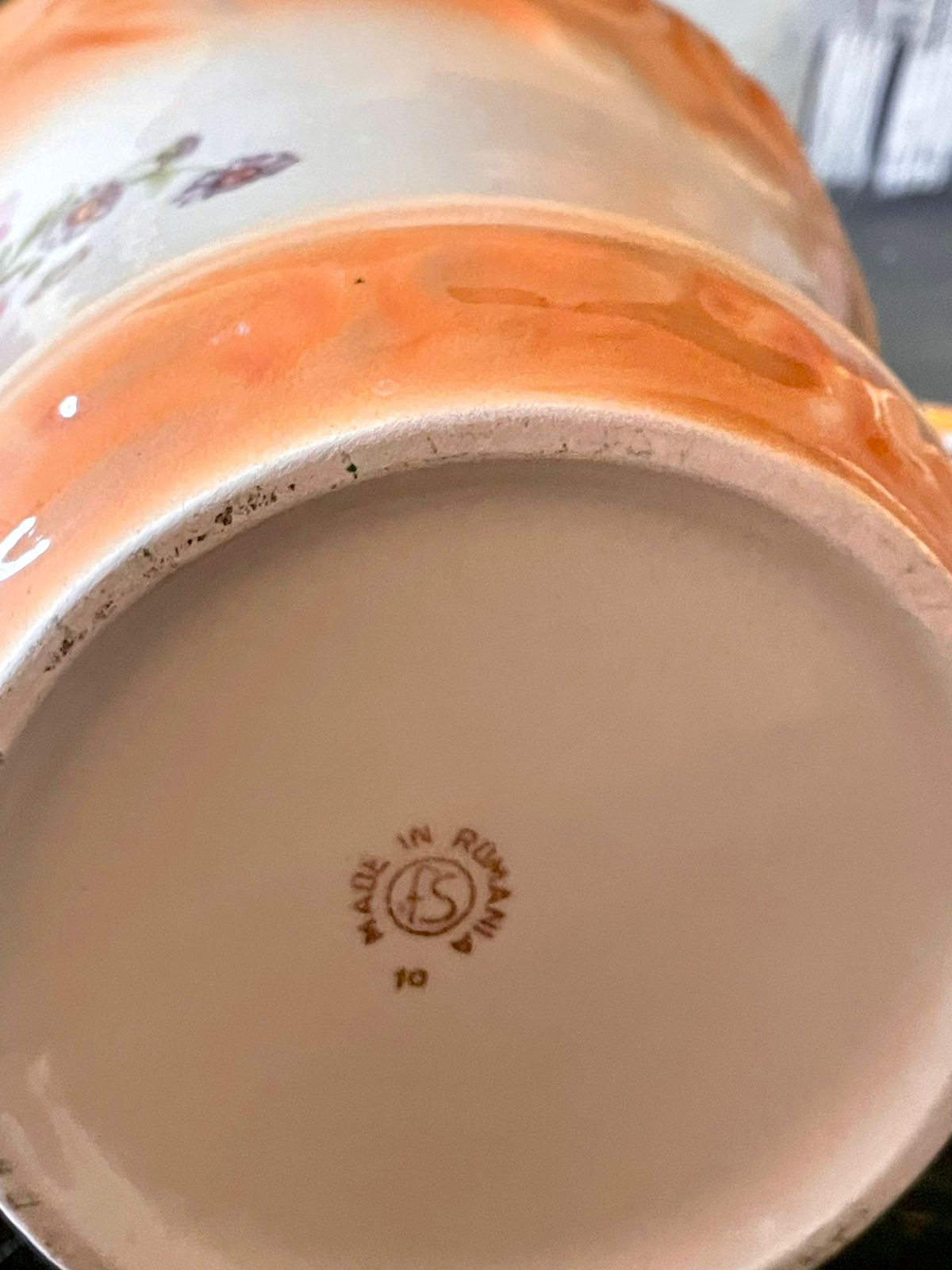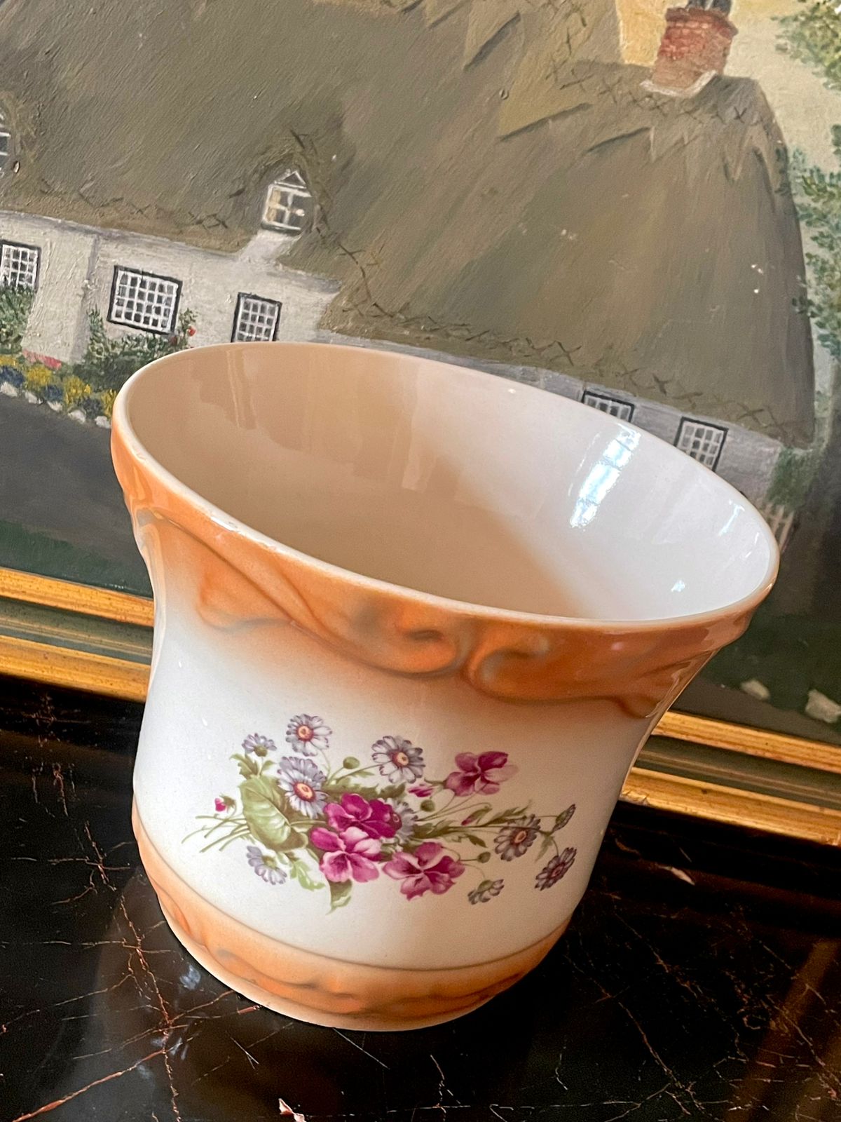 • Design: Features a charming two-tone peach and ivory glaze with embossed scroll detailing and a hand-painted floral bouquet in pinks and purples